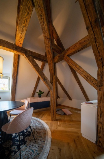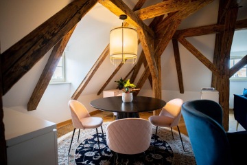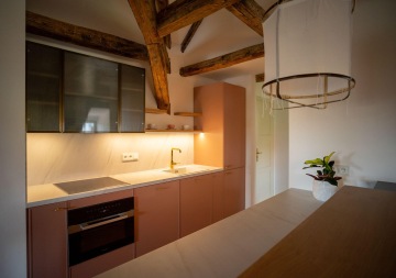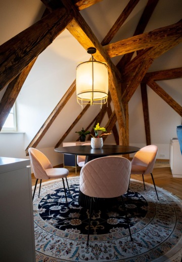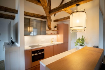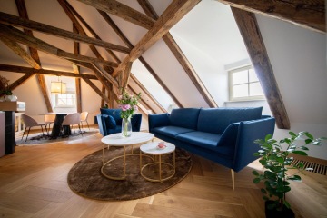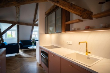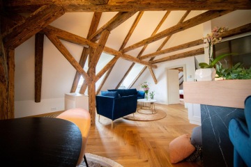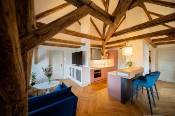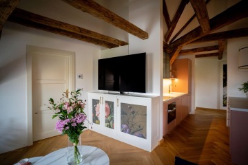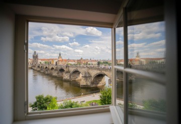 Unique layout with a separate bedroom with built-in wardrobes and en-suite bathroom, generous living room with a fully equipped custom-made kitchen with Miele appliances, and beautiful views of the Charles Bridge and the Vltava River.