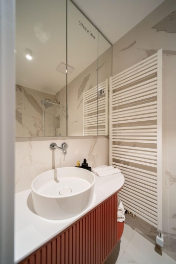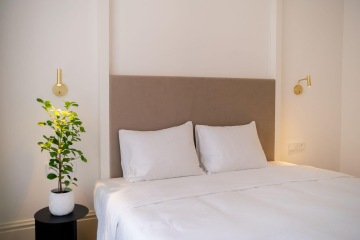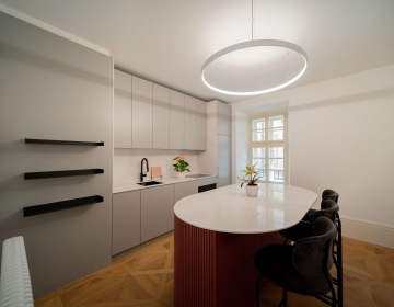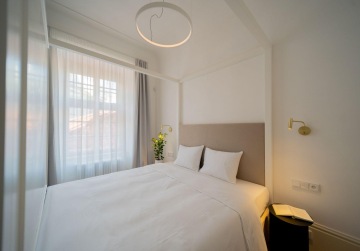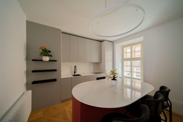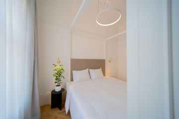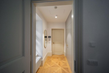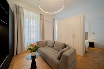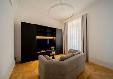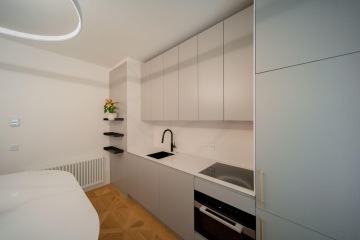The luxurious interior consists of a living room together with bedroom, a fully equipped kitchen with a dining room a bathroom (shower, toilet) and an entrance hall. Top quality materials and finishes, new equipment, air conditioning, wooden parquet floors, tiles, built-in wardrobes, gas boiler, Miele appliances, washer, dryer.